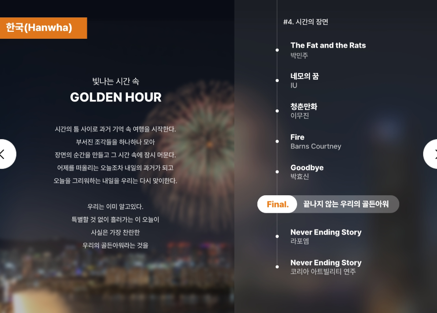 - 특징: 단순 중계가 아닌, 음악과 완벽하게 조화된 불꽃 영상을 초고화질로 제공하여 현장보다 더 디테일한 감동을 선사합니다.