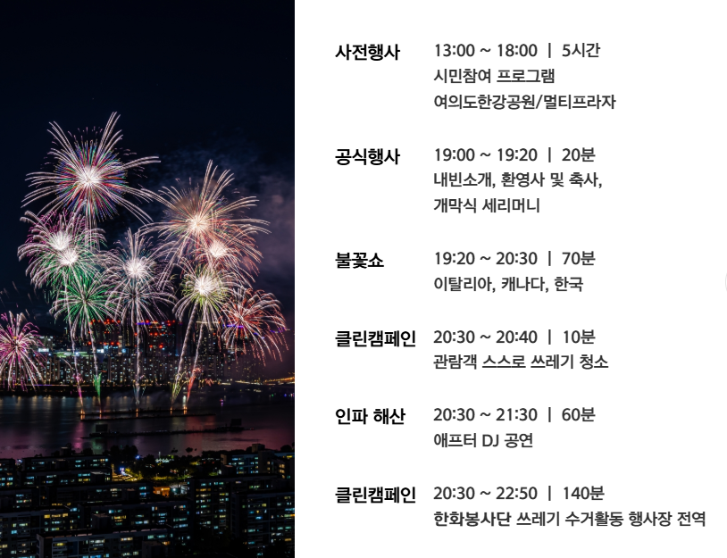 | 19:20 ~ 20:00 | 본 공연 (불꽃쇼) | 이탈리아, 캐나다, **한국(한화팀)**의 화려한 불꽃쇼 |
