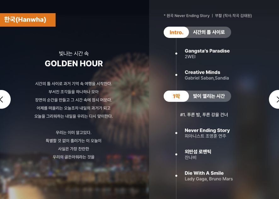 | 20:00 ~ 21:00 | 피날레 및 마무리 | 한화팀의 대규모 피날레 불꽃과 주제 연출 |