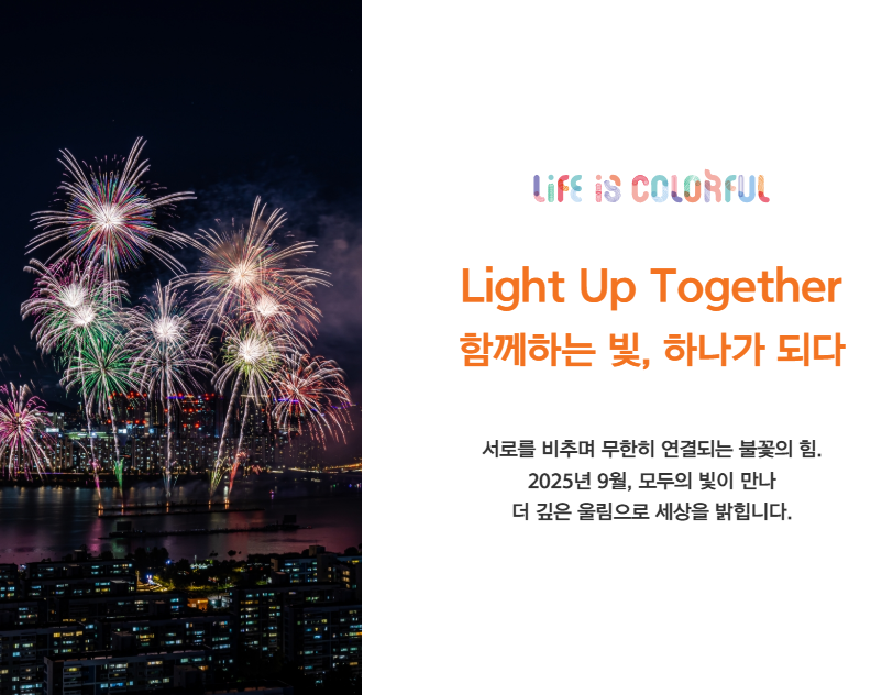 올해 축제는 “Light Up Together! ✨”라는 주제로 열립니다. 주제 속에는 모두가 함께 하나의 빛이 되어 희망과 감동을 나누자는 메시지가 담겨 있습니다. 매년 수백만 명의 관심을 모으는 대표 가을 행사로, 이번에도 여의도 한강공원에서 대규모로 진행됩니다. 특히 불꽃축제 생중계를 통해 오프라인에 참석하지 못하는 분들도 온라인으로 축제의 현장을 느낄 수 있습니다.